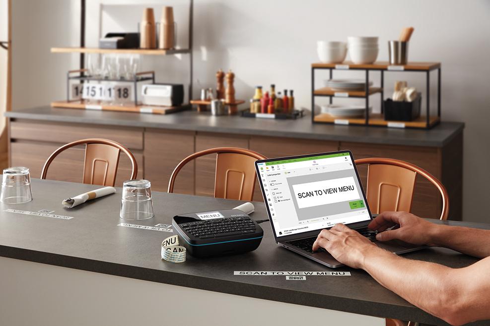 Obsah dodávky: přístroj pro popisování, 3 popisovací pásky 12; 19; 24 mm (černobílá), návod k použití, USB-C kabel a softcase taška.