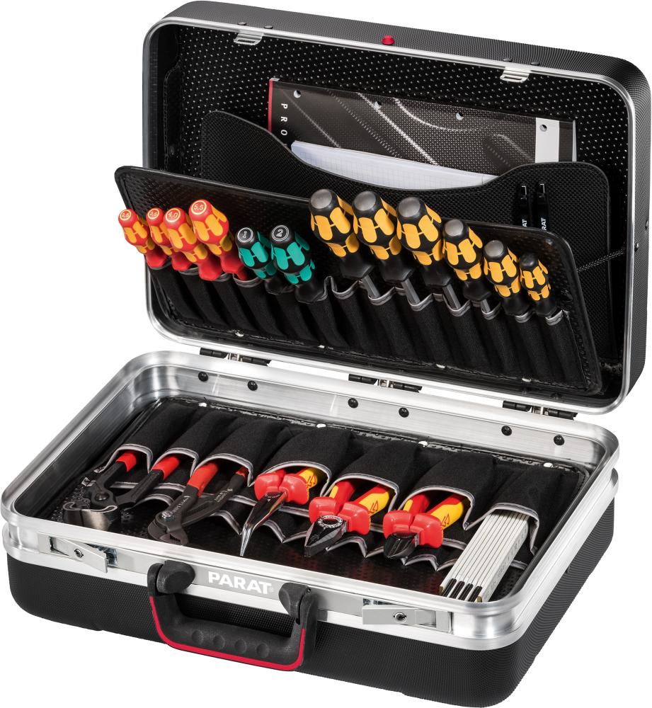 Prevedenie: Z plastu X-ABS odolného proti opotrebeniu, odolného proti vlhkosti, čierneho, s pevnými doskami na náradie z materiálu Con-Pearl® pre odolnosť proti poškriabaniu, tvarovú stabilitu a odolnosť proti vlhkosti, tukom a chemikáliám as držiakom veka a stabilnou rukoväťou. Škrupina dna s výškou 58 mm, voľne rozdeliteľná. S pozinkovanými kovovými kĺbovými závesmi as hliníkovým obvodovým rámom, zaťažiteľným až do 20 kg. Veľmi stabilný as ochrannými, integrovanými klznými lištami. Zamykateľný 2 klopnými zámkami. Dodáva sa bez obsahu.