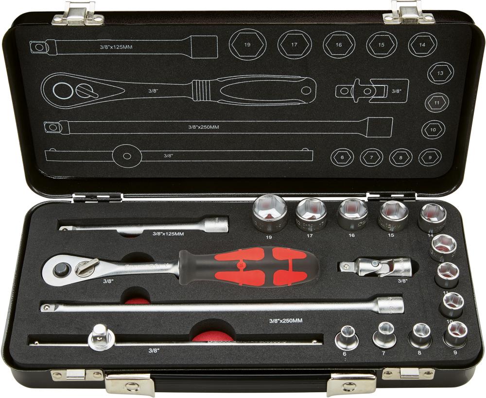 | Provedení | Obsah sady: 1 ráčna s přepínací páčkou 12 hlavic pro šestihranné nástrčné klíče 6;7; 8; 9; 10; 11; 13; 14; 15; 16; 17; 19 mm 1 příčná rukojeť se smýkadlem 2 prodloužení 125; 250 mm 1 kardanový kloub |