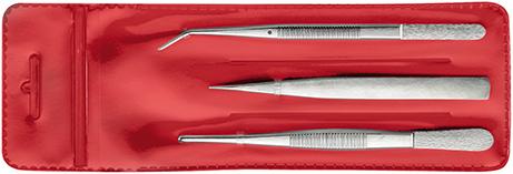 | Provedení | Obsah sady: 1 College pinzeta, 155 mm, ohnutá, s vodicím kolíkem, úzký ozubený hrot 1 univerzální pinzeta, 130 mm, špičatá 1 univerzální pinzeta, 145 mm, tupá | |