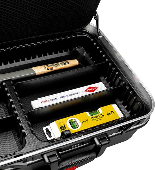 Prevedenie: Z odolného plastu ABS, s nástrojovými a krycími doskami. Dve vyberateľné dosky na náradie s 31 osaditeľnými vreckami na náradie. Kufor s individuálne deliteľnými vložkami v 70mm hlbokej spodnej priehradke a jej krycej doske so 14 veľkými vreckami na náradie. Stabilné rastrové závesy s kovovými otočnými zámkami a trojmiestnym číslovým kódovacím zámkom pre bezpečné uzatvorenie veka
