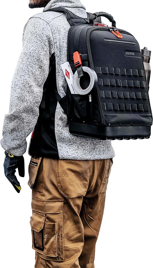 Provedení: Z recyklovaných umělých vláken. Výklopná přední a zadní část s odnímatelnou deskou na nářadí. Ergonomické zadní polstrování a optimální flexibilita díky adaptérům FIDLOCK® a popruhům MOLLE. 21 záchytných popruhů a 37 kapes, některé se zipy Skořepina dna z plastu s odolností proti nárazu, výška 60 mm. S poutkem kufru pro upevnění k teleskopickým tyčím kufrů na nářadí.